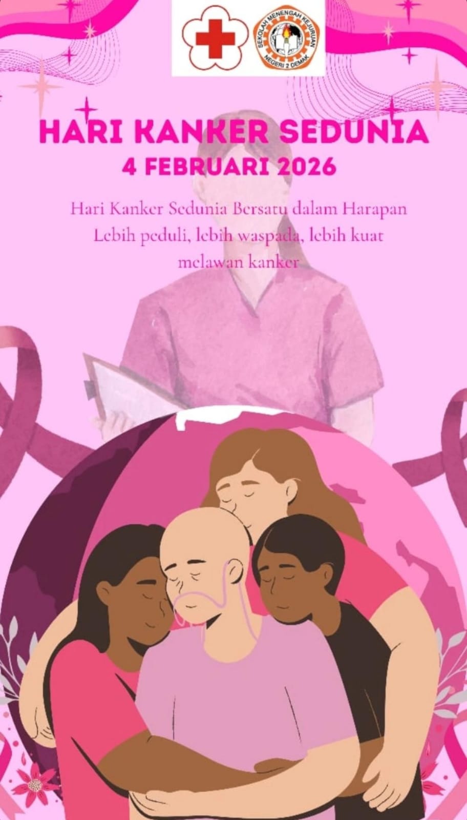 Demak, 04/02/2026 - Dalam rangka memperingati Hari Kanker sedunia, SMKN 2 Demak mengajak seluruh warga sekolah, khususnya para remaja, untuk meningkatkan kesadaran akan pentingnya mengenal kanker sejak dini serta menumbuhkan sikap empati kepada para penyitas dan pejuang kanker.